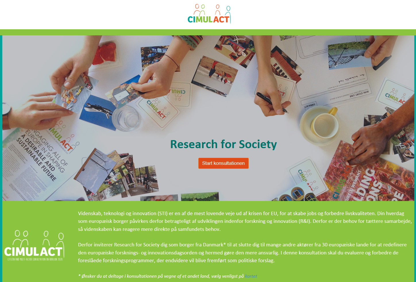 Formålet med Research for Society-konsultationen er at spørge både almindelige borgere og eksperter fra 30 europæiske lande, hvilke forskningsområder der er størst behov for at prioritere. Du skal derfor ikke have særlig viden for at deltage. Idéen er nemlig at viderebringe almindelige borgeres holdninger til beslutningstagere i EU. Din hverdag påvirkes betragteligt af udviklingerne inden for forskning og innovation. Derfor arbejder CIMULACT ud fra den anskuelse om, at der er behov for et tættere samarbejde og mere dialog mellem alle relevante samfundsaktører, så forsknings- og innovationsprojekter i højere grad kan reagere mere direkte på samfundets behov.